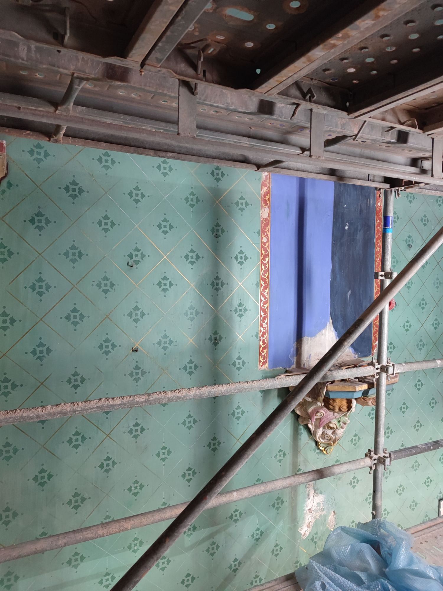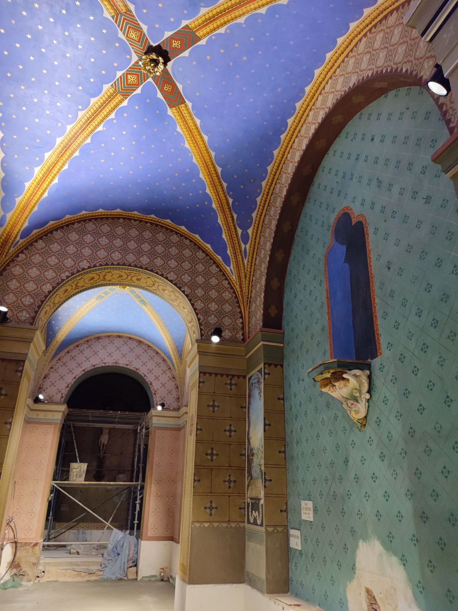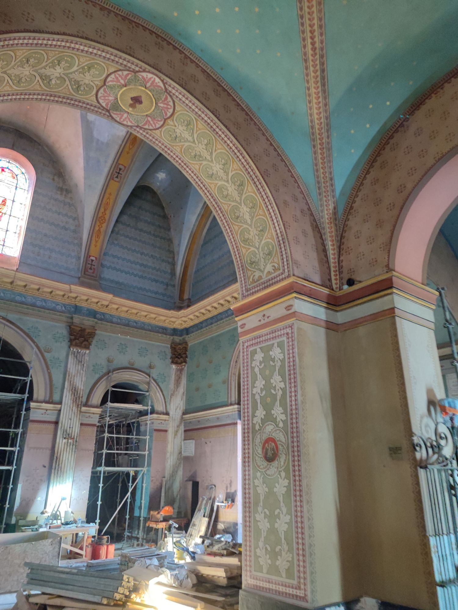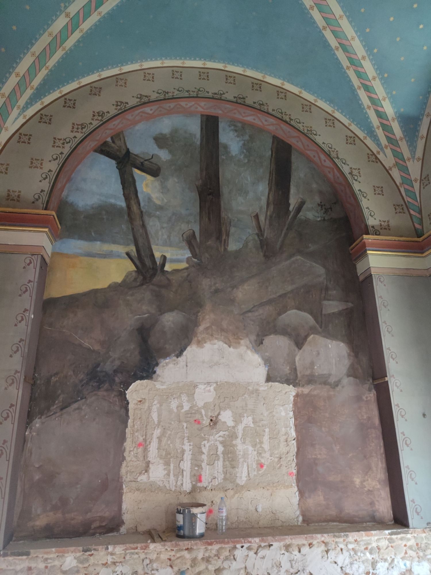 Les peintures murales, présentes dans de nombreux édifices historiques, sont souvent exposées aux agressions du temps, à l’humidité, aux fissures ou à la dégradation des pigments. Mon travail de restauration consiste à stabiliser les couches picturales, à réparer les fissures et à rétablir les couleurs dans le respect des techniques originales. Collaborer avec des ateliers spécialisés dans la restauration de monuments historiques me permet d’intervenir sur des fresques et décors peints classés, en suivant des protocoles stricts établis par les experts du patrimoine.